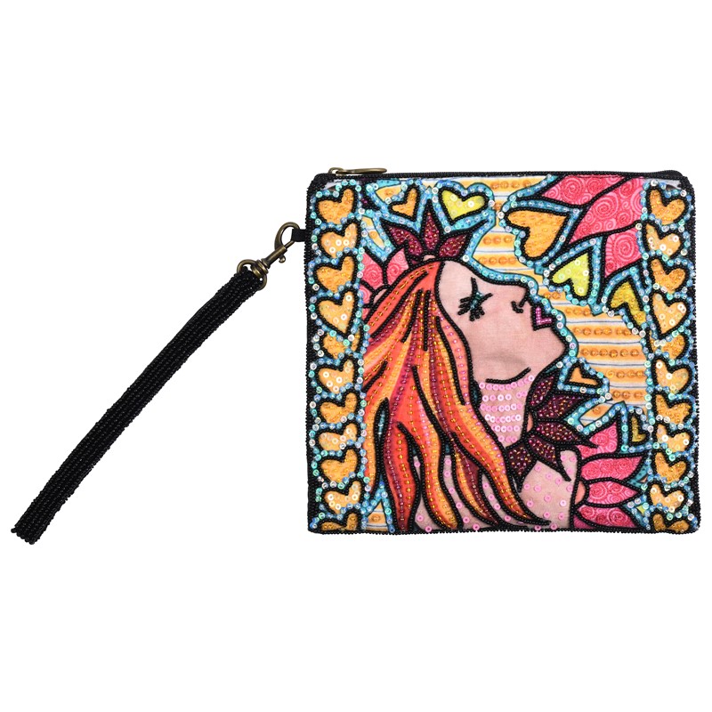Wear her as a clutch, or as a wristlet. 7.5" W x 7.5" H - holds a cell phone, lipstick, sunglasses, keys, cash, and cards.
